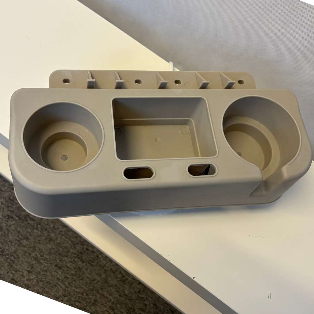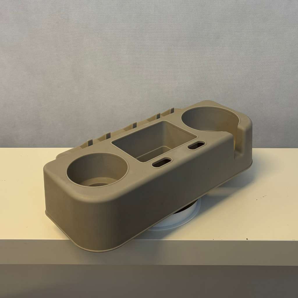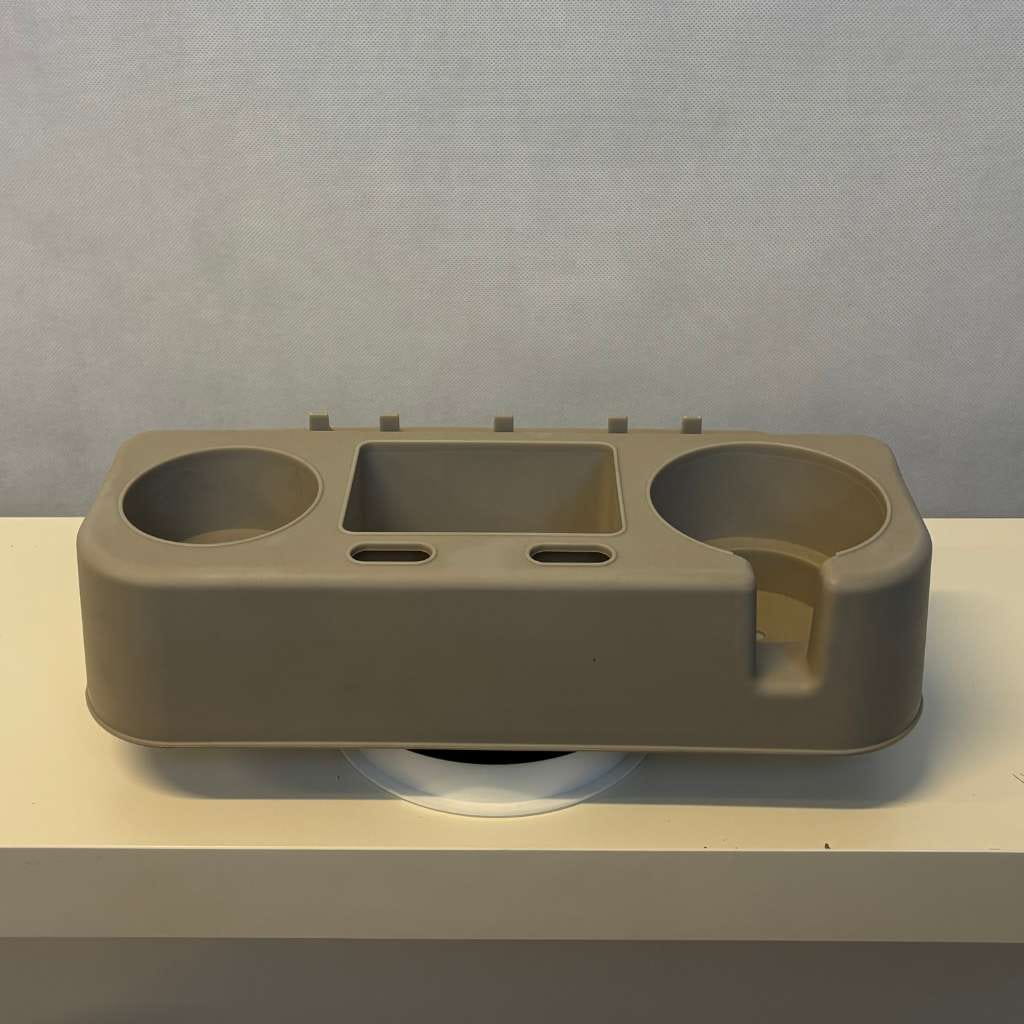 • Dwa uchwyty na kubki z rowkami o różnych rozmiarach, aby pomieścić kubki o różnych rozmiarach. Jeden schowek na akcesoria.